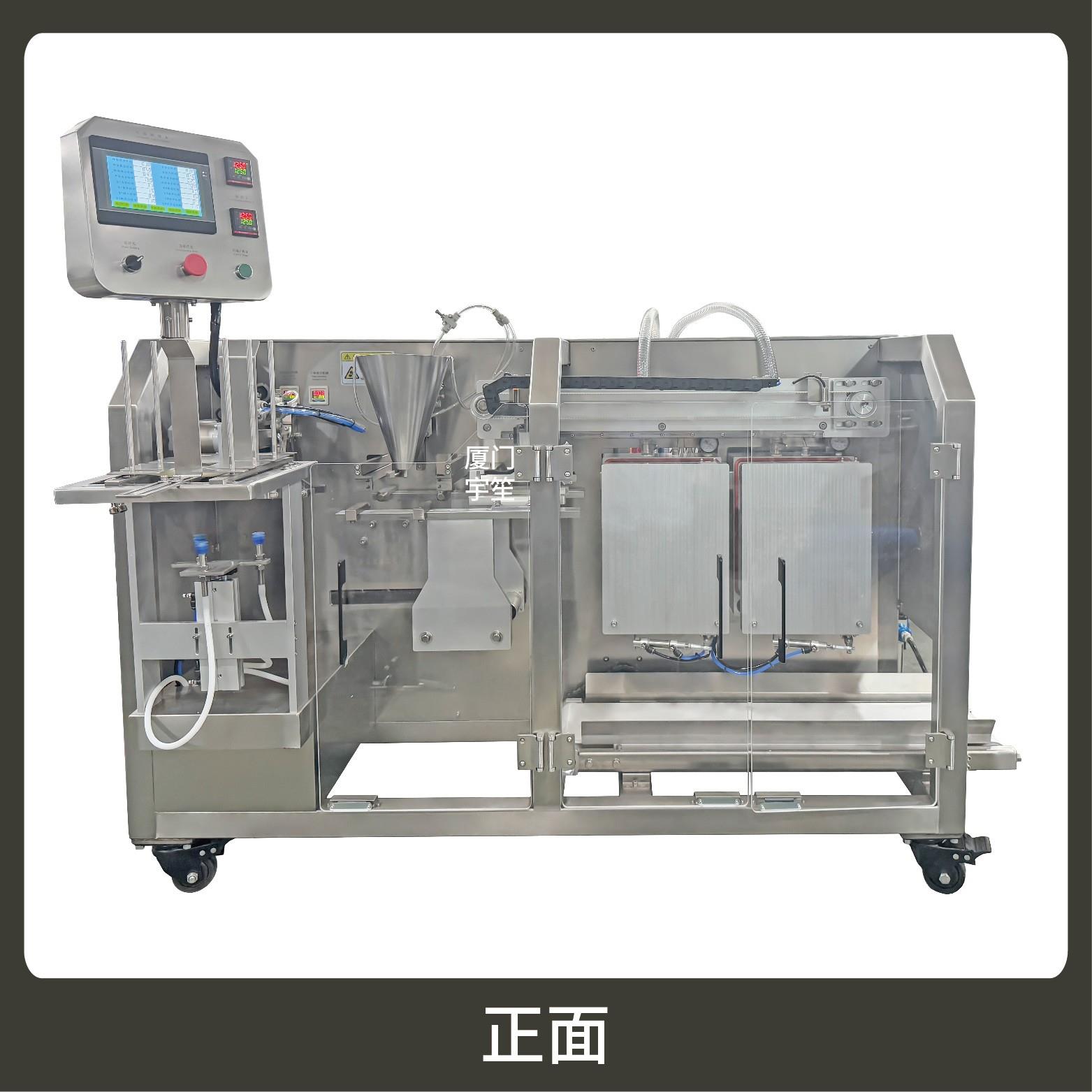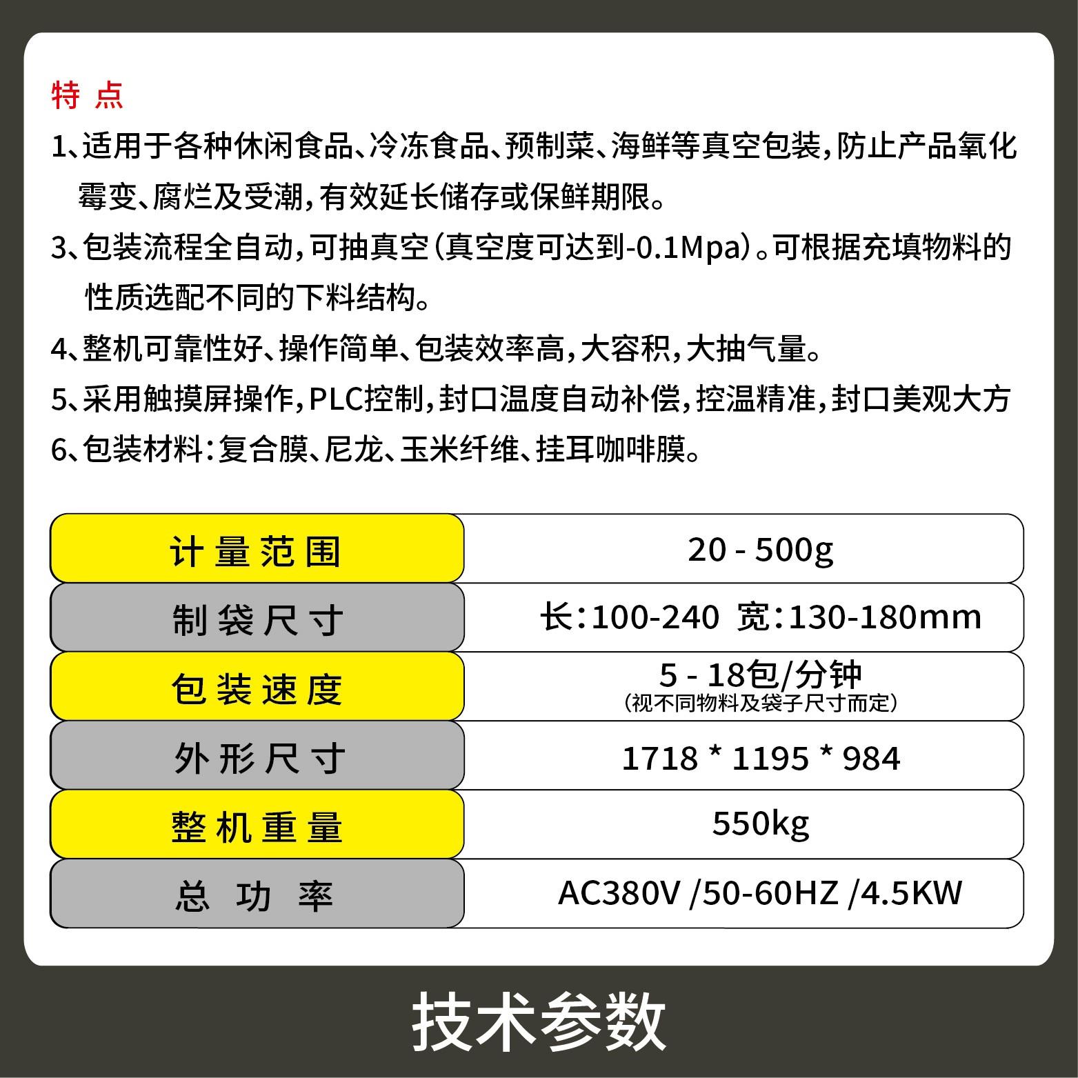 2、包裝流程全自動,可抽真空(真空度可達到-0.1Mpa)??筛鶕?jù)充填物料的性質(zhì)選配不同的下料結(jié)構(gòu)。